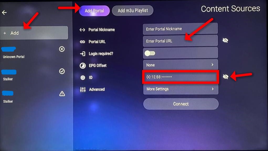 Ici vous avez un identifiant de votre box, cliquez sur l’icône en forme d’œil pour voir l’ID MAC complet. vous devez envoyer cet ID MAC à votre fournisseur IPTV et il ajoutera le MAC dans le système et vous donnera l’ URL du portail . Ensuite, vous devez ajouter l’URL du portail ici sur cette page. Désactivez la connexion requise, dans la dernière étape cliquez sur « Connecter » pour charger les chaînes.